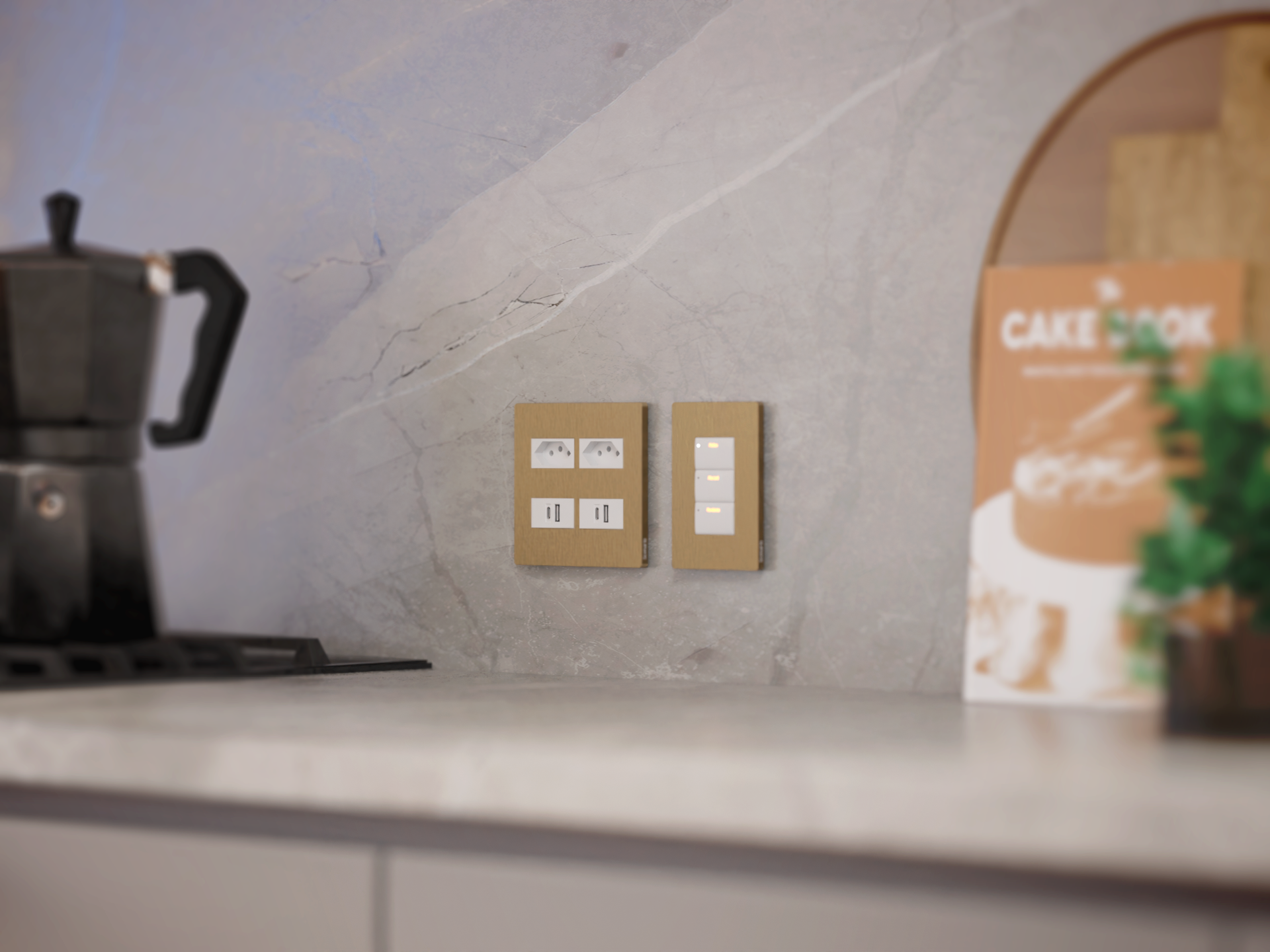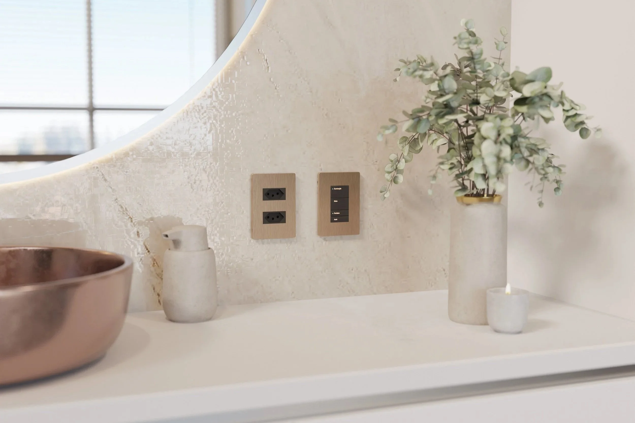 Tomadas Scenario com o mesmo design elegante dos keypads, garantindo harmonia estética. Módulos 10A, 20A, USB e fechamento cego.