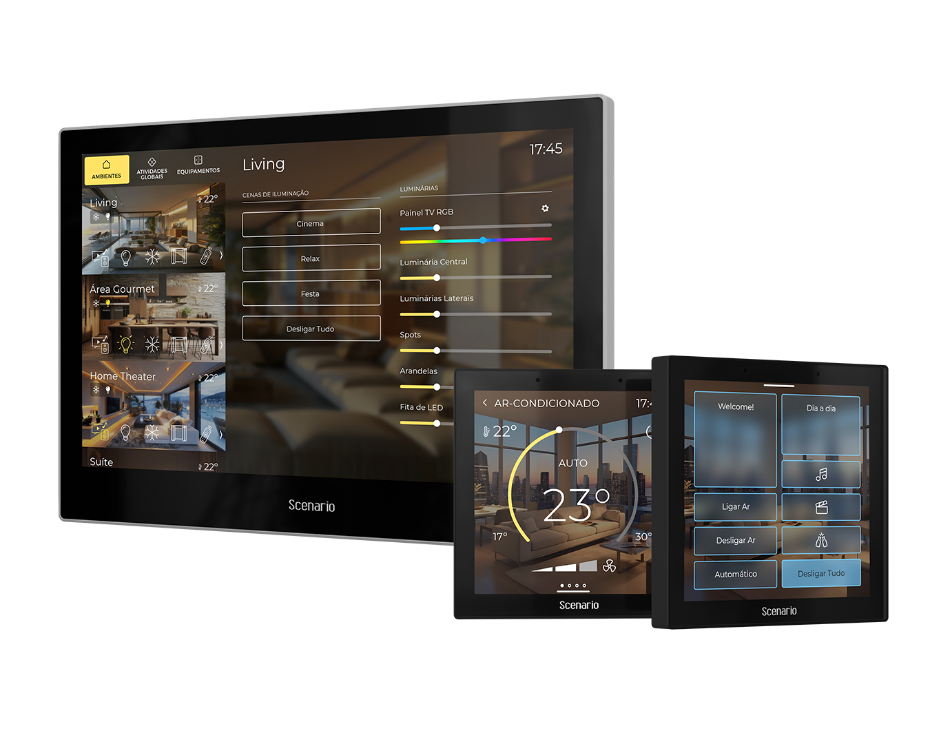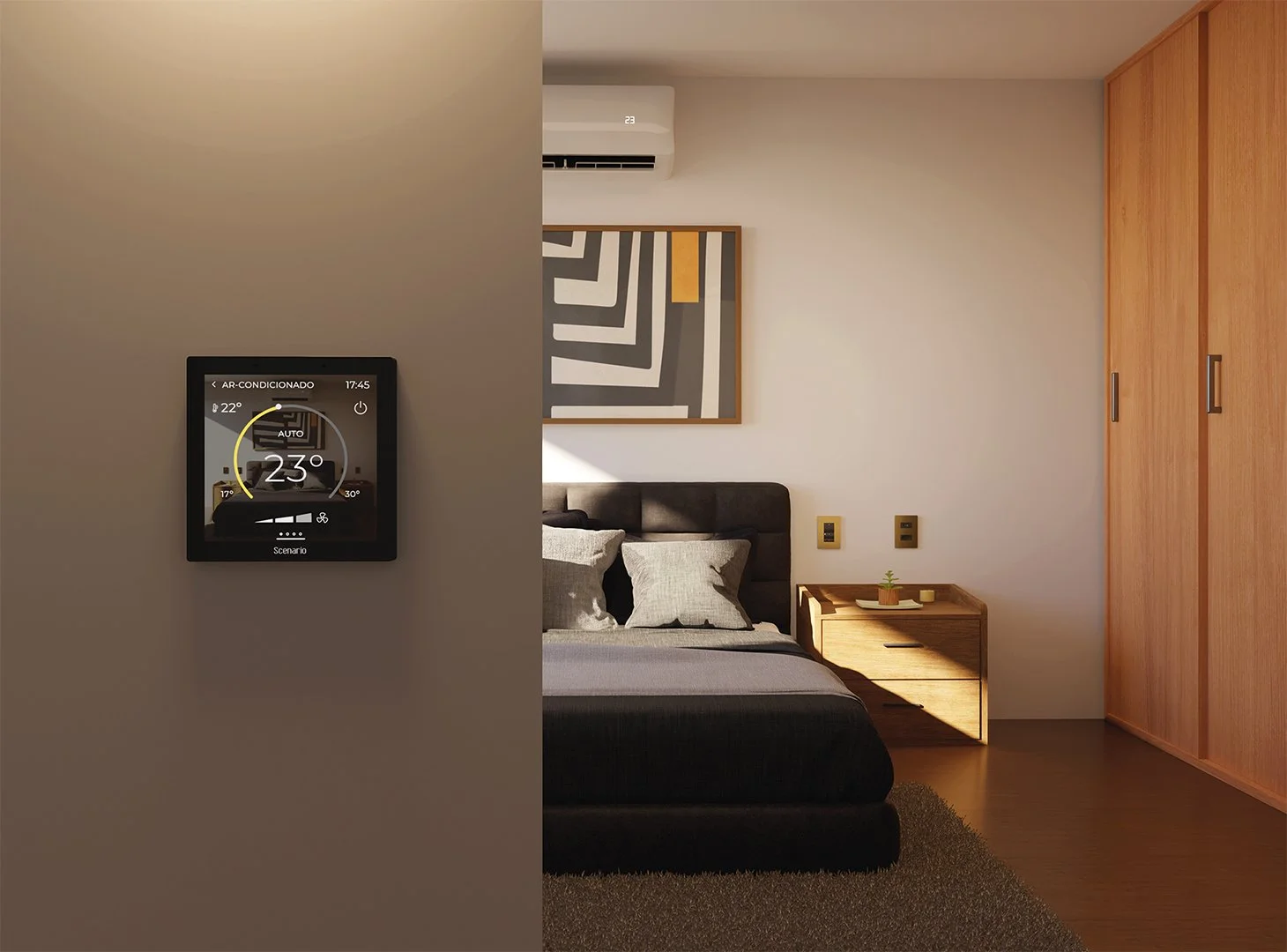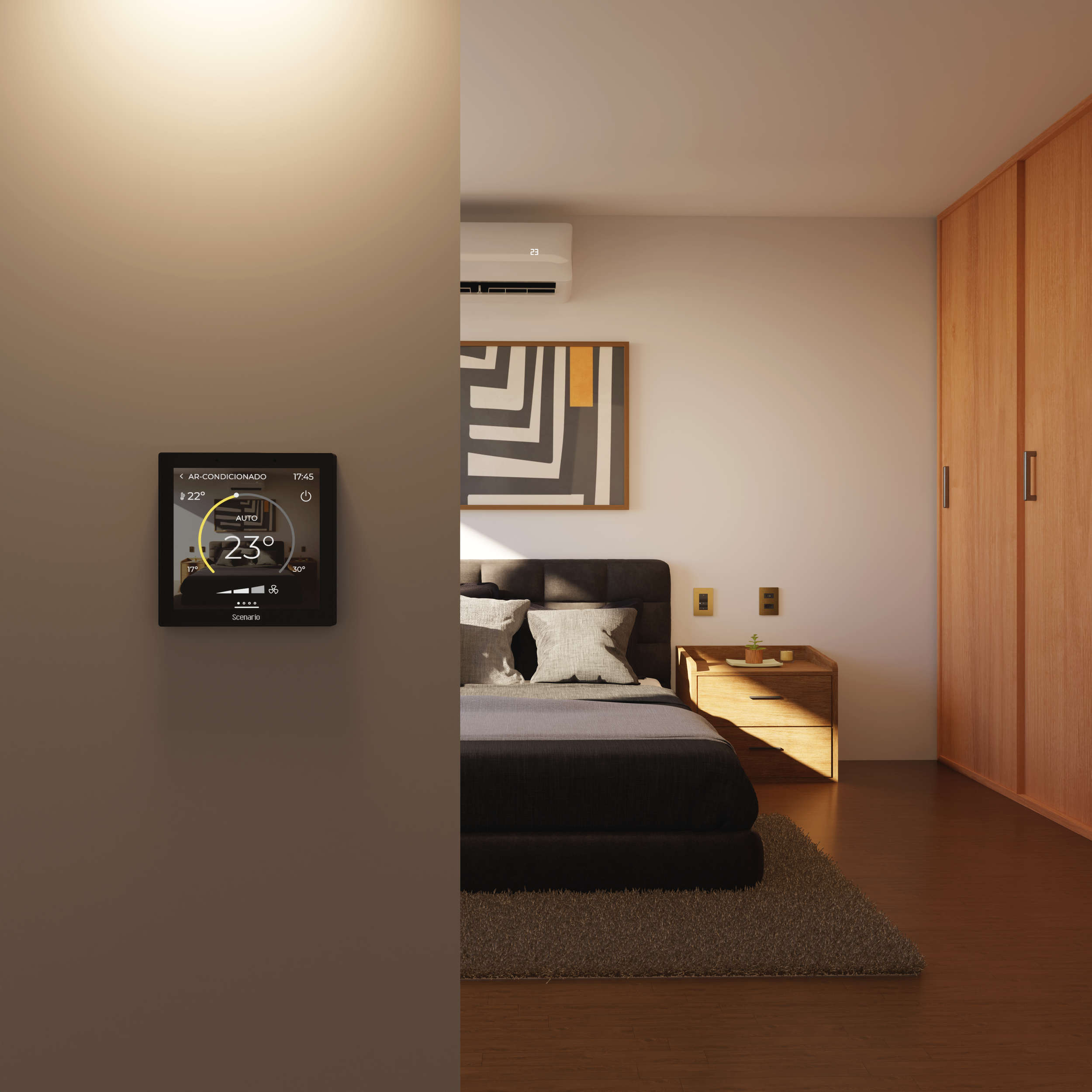 Painel touch de parede compacto com tela de 4 polegadas totalmente integrado ao sistema Embrace, é uma opção versátil para uso residencial, comercial ou hoteleiro. Transforma qualquer ambiente em um espaço inteligente e conectado. Com uma experiência de controle completa e intuitiva é possível controlar iluminação, climatização, cortinas e sistemas de áudio e vídeo.